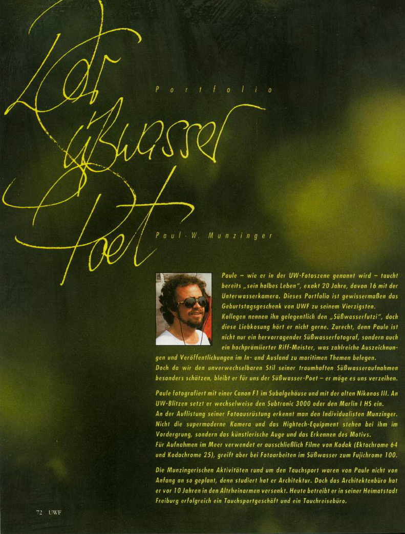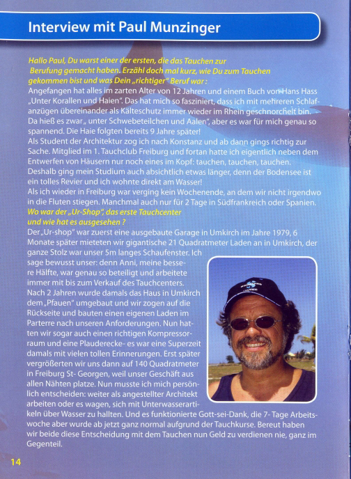 Paul-W. Munzinger, Jahrgang 1951, ehemals Architekt und Diplom-Ingenieur, machte im Jahre 1990 sein Hobby zum Beruf: Er wurde Unterwasserfotograf und freier Journalist. Er erhielt über 60 Internationale Auszeichnungen für UW-Fotografie, arbeitete an mehr als zwei Dutzend Bücher zu den Themen Tauchen sowie Reisen und schrieb ungezählte Stories aus aller Herren Länder. Bis 2014 hatte er über 12 000 Tauchgänge in seinen Logbüchern und war mit Reportagen in diversen Magazinen vertreten, z.B. in TAUCHEN, Unterwasser, Atlantis über GEO bis zu National Geographic- und nach wie vor ist er immer auf dem Sprung nach neuen und spannenden Themen rund um das Thema Wasser. Für einige Veranstalter leitet er auch geführte Tauchtouren und arrangiert selbst Abenteuerreisen rund um den Globus. Paul-W. Munzinger lebt in Freiburg und taucht, wenn er nicht gerade auf Reisen ist, am liebsten im heimischen Süßwasser. Zunehmend setzt er sich für bedrohte Meerestiere sowie für den Naturschutz ein.